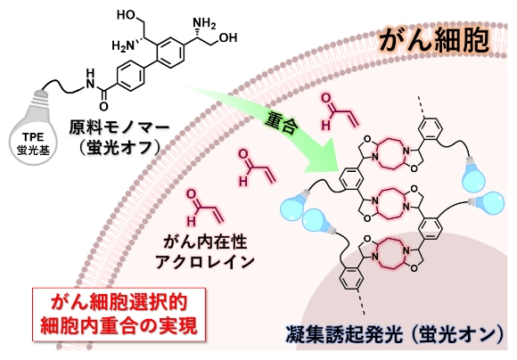 この手法では、設計された原料モノマー[2](meta-フェニレン-ビス(2-アミノエタノール))が触媒や外部刺激を一切必要とせずに、がん細胞内部に存在するアクロレインと選択的に二量化カスケード反応[3]を起こして8員環(1,5-ジアザシクロオクタン環)を構築しながら高分子鎖を形成します。さらに、このモノマーに凝集誘起発光(AIE)[4]特性を有するテトラフェニルエチレン(TPE)蛍光基を組み込むことで、ポリマーが形成されると同時に蛍光がオンになる現象が起こり、がん細胞だけを選択的かつリアルタイムに可視化することが可能となりました。