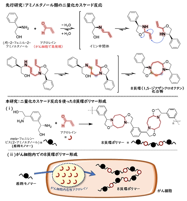 がん細胞だけに豊富に存在するアクロレインが、エタノールと反応して8員環を温和かつ迅速に形成することができる。本研究ではこの知見を応用し、がん細胞内のアクロレインを"起爆剤"として8員環ポリマーの合成に挑んだ。