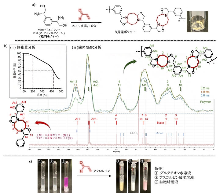 共同研究グループはまず、アクロレインと選択的に反応する二つのアミノエタノール構造を持つ原料モノマー(meta-フェニレン-ビス(2-アミノエタノール))を5工程の化学変換を経て合成しました。この原料モノマーを水中・室温下で試薬のアクロレインと反応させると、瞬時に8員環構造が連なったポリマーが得られました(図2a)。実際に熱重量分析[5]および固体NMR分析[6]の結果から、原料モノマーとアクロレインが二量化カスケード反応によって、8員環構造に連なっていることを確認しました(図2b)。この反応において、触媒や外部刺激は一切必要ありません。さらに、生体内に存在するグルタチオンやアスコルビン酸の存在下や、細胞培養液中でも重合が確認されたことから、重合は生体内でも進行する可能性を示しました(図2c)。