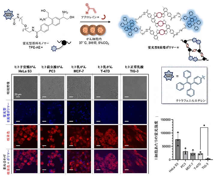 TPE-AEモノマーを4種のがん細胞および正常細胞に投与した結果、がん細胞に存在するアクロレインと原料モノマーが重合し、TPE蛍光基が密集したことで強い青色蛍光を観測できたのに対し、正常細胞では非常に弱い蛍光しか観測されなかった。