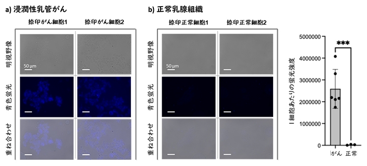摘出直後の乳がん(浸潤性乳管がん)組織をTPE-AE原料モノマー溶液に1分間浸し、スライドガラスに捺印(なついん)して観察すると、がん組織由来の捺印細胞が明るく発光した。一方、正常乳腺組織は発光しなかった。蛍光強度の差でがんと正常細胞を判別できる可能性が示された。
