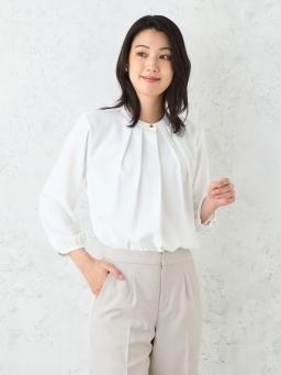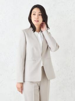 4. きちんと感を保ちながらも女性らしい柔らかな印象のノーカラースタイルで、様々なシーンに対応