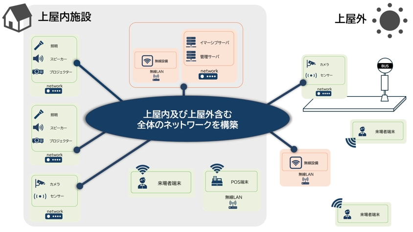 プロジェクトに参加した関係各社と協働し、イマーシブアートの根幹となるプロジェクター・音響・照明全体のコアネットワークを設計・構築。 - 屋内外における監視カメラおよび無線LAN構築