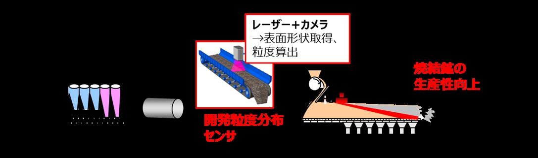 焼結鉱の製造工程では、複数の鉄鉱石微粉に水分を加えて造粒し、造粒物を焼結機で高温焼成することで焼結鉱を製造します。この造粒物の粒径にばらつきがあると、焼結機上の原料層内の空気の流れや温度分布が不均一となり、焼結鉱の品質や生産性を低下させる要因となります。従来、この粒度分布の管理について、オペレーターがコンベア上の造粒物のサンプルを手作業で採取し、粒径に応じて分離する装置を用いて分析していました。しかし、人手による作業負荷が高いことに加えて、分析頻度が少ないため、分析結果を反映した操業条件の調整に時間を要することや、粒径のばらつき発生が課題となっていました。今回当社が開発したセンサでは、コンベア上に設置したレーザーとカメラにより造粒物の表面形状を立体的に取得し、画像処理によって粒度分布を常時算出します。これにより、粒度分布をリアルタイムで把握し、操業条件の即時調整が可能となり、造粒物の粒径のばらつき低減および焼結鉱の生産性向上を実現しました(図1)。また、本技術は当社の独自技術として、焼結鉱の製造分野への適用にとどまらず、ソリューションビジネス「コンベア搬送物のオンライン粒度計」として、鉄鋼業界も含めた製造業全般のお客様への展開も進めていきます。