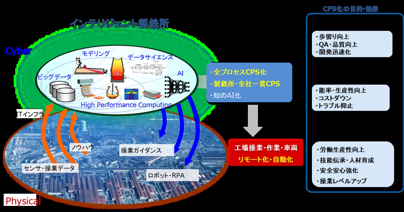 当社は、DX戦略の一環として製鉄所全体にCPS*1 (サイバーフィジカルシステム)を活用した「インテリジェント製鉄所」の実現を目指しています(図2)。今後も製造プロセスや製品品質のCPS化を進めるなど、DXを積極的に推進することで、革新的な生産性向上および安定操業を実現してまいります。また、製造現場におけるあらゆる分野の課題を、DXを通じて解決していくとともに、そのノウハウをソリューションビジネス「JFE Resolus® 」として積極的にお客様に提供し、持続可能な社会の実現に貢献してまいります。