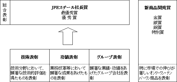 技術分野および業務改革等において会社経営に貢献した顕著な成果に対し表彰を行なうもので、(1)案件の内容に応じて「技術表彰」、「功績表彰」、「グループ表彰」に分類表彰され、主にそれらの中から特に優れたものを表彰する『JFEスチール社長賞』と、(2)オンリーワン・ナンバーワン商品の拡大に向けた『新商品開発賞』の、2つの賞から構成されます。表彰制度の概要は、以下の通りです。