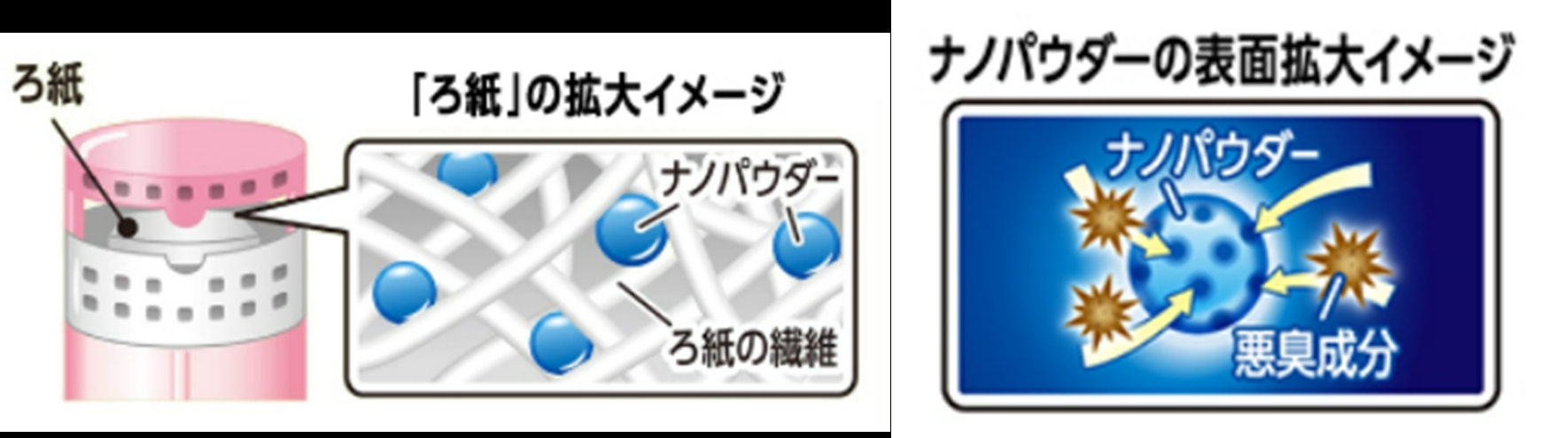 この特許技術は消臭芳香剤「消臭力 玄関・リビング用」や「消臭力 トイレ用」に採用されています。ろ紙に配合されているナノパウダーは、ナノレベルの孔(あな)を持つ消臭剤で、この孔がさまざまな悪臭をすばやく強力に吸着することで、お部屋の複合臭やトイレ特有の尿のしみつき臭など、イヤなニオイを消臭しています。