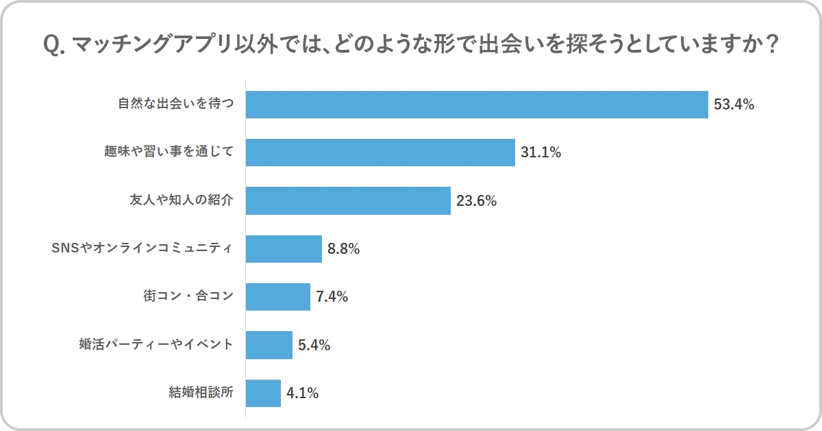 「マッチングアプリ以外では、どのような形で出会いを探そうとしていますか?」という問いに対しては、最も多かったのが 「自然な出会いを待つ」(53.4%) でした。次いで、