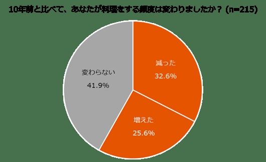 50代以上の方に、10年前と比較した調理頻度の変化を尋ねたところ、「変わらない」(41.9%)が最も多かったものの、「減った」(32.6%)、「増えた」(25.6%)と回答した人も多く、調理頻度に見直しがなされている様子がうかがえました。