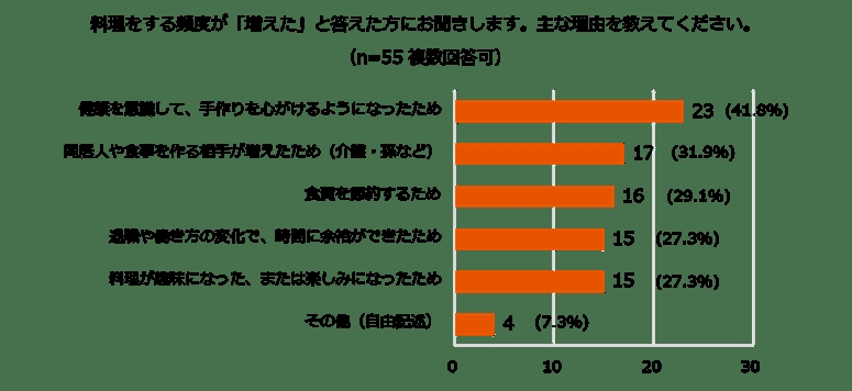 一方で、調理頻度が「増えた」と回答した方の理由は、「健康を意識して、手作りを心がけるようになったため」(41.8%)がトップでした。セカンドライフを見据え、自身の健康や家計、時間の使い方を改めて見直す中で、調理が新たな役割を担っている様子がうかがえます。