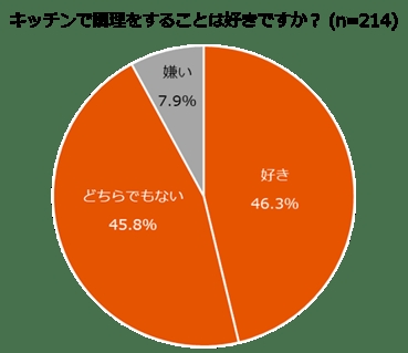 次に、調理に対する気持ちを深掘りしました。「キッチンで調理をすることは好きですか」という質問に対しては、「好き」(46.3%)と「どちらでもない」(45.8%)がほぼ半数を占め、「嫌い」はわずか7.9%でした。