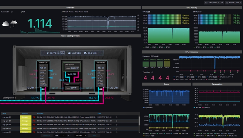 水冷GPUサーバー、サーバー冷却設備を実証実験用に提供するとともに、コンテナ型データセンター内の環境・ハードウェア・ソフトウェアを統合的に管理する統合モニタリングツールを構築