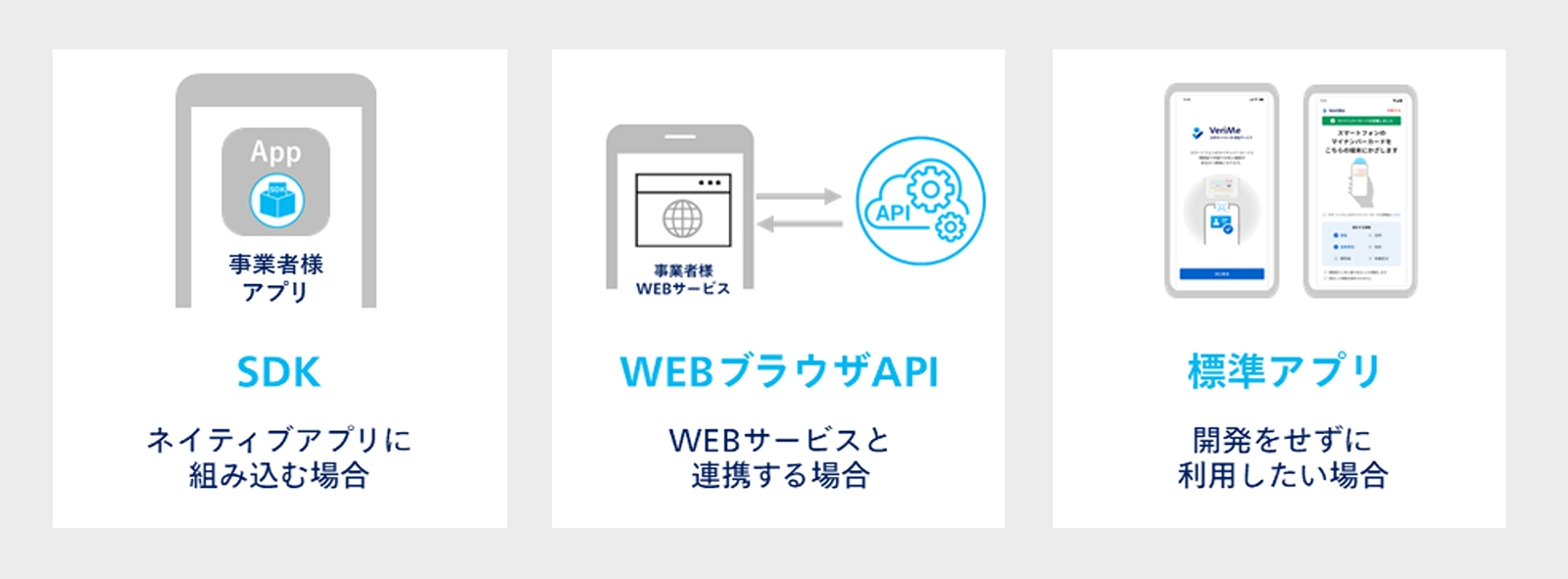 各事業者がiPhoneのマイナンバーカード情報を読み取るためには専用アプリケーションの開発が必要です。「VeriMe」では、事業者向けにAndroid OS用のSDK(ソフトウェア開発キット)を提供しています。今回のアップデートでは、Windows OS用のSDK、およびWEBブラウザAPI(※2)を提供します。対応OSの拡充により、事業者は既存システムへの組み込みが容易になることに加え、事業者のWEBサービス上での利用が可能になることで、開発工数を削減しながらより簡易的に導入ができます。
