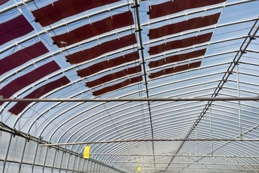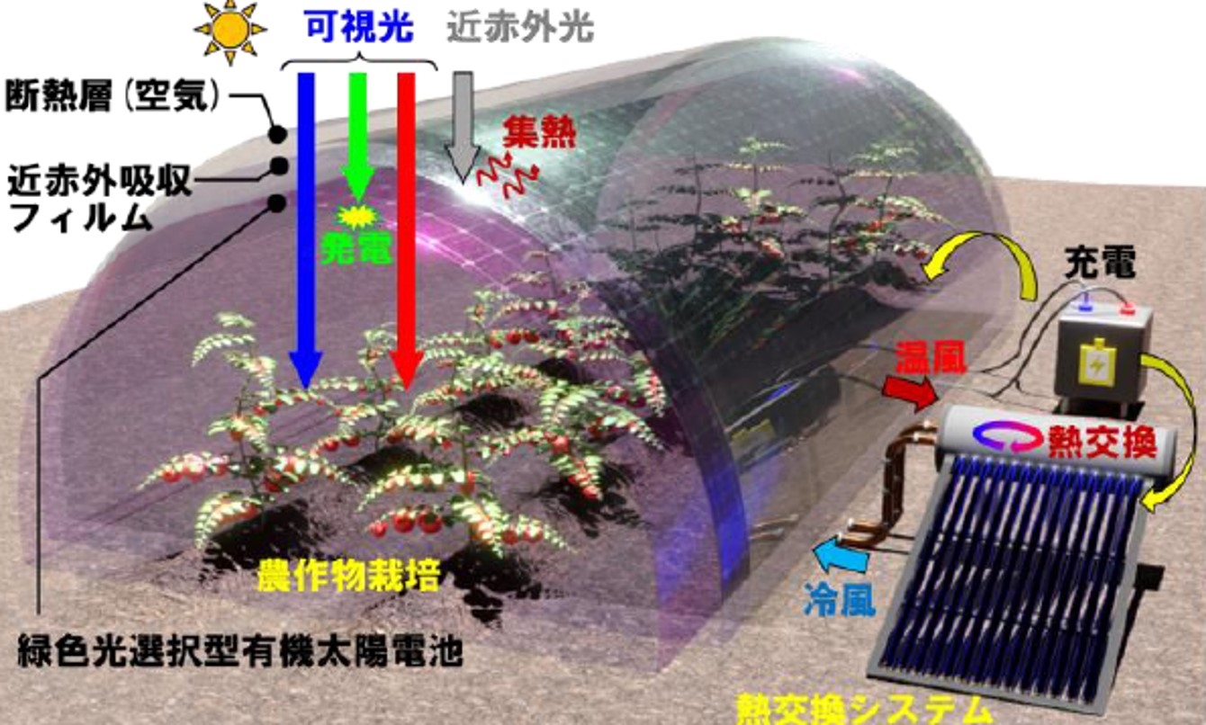 植物に必要な光を通しながら緑色光で発電し、ハウス内の温度上昇抑制にも寄与