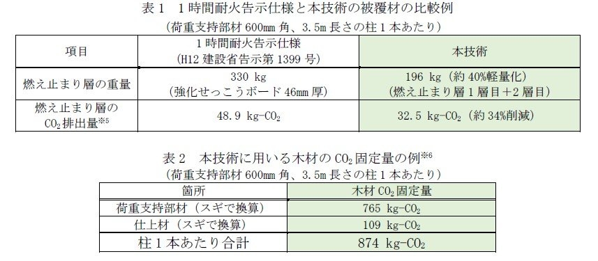 一般技術の木造1時間耐火柱の告示仕様※3では、耐火被覆に強化せっこうボードの使用が定められていますが、重量が重く施工に手間がかかることが課題でした。そこで本技術では、燃え止まり層に2種類(ハイブリッド)の被覆材(カバー)を用いることで、同等の耐火性能を保ちながら、燃え止まり層の重量を約40%軽量化、CO2排出量を約34%削減しました。これにより、施工性向上と環境配慮を両立する耐火柱として、国土交通大臣の認定を取得しました。(特許取得済み※4)