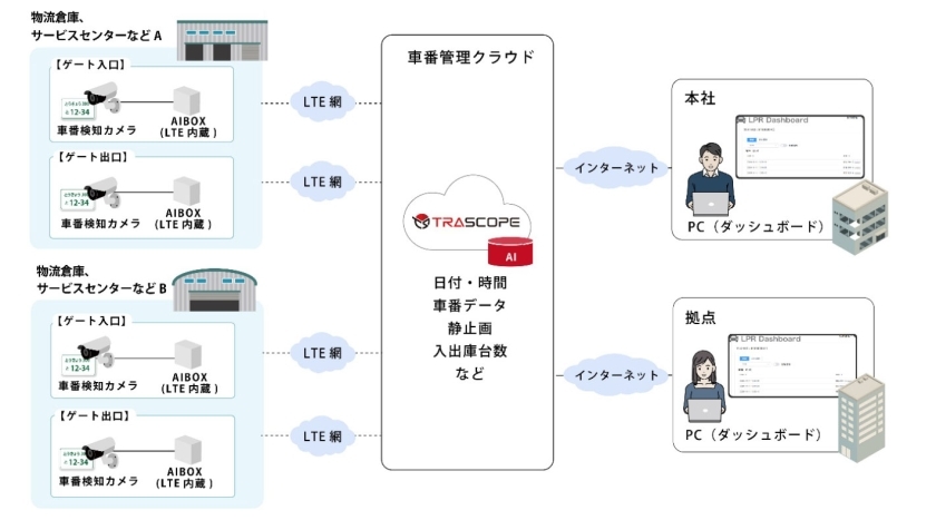 新物流効率化法対策ソリューションは、物流拠点の出入口に設置した車番検知カメラとAIBOX、車番管理クラウドを組み合わせることで、トラックの入場・退場時刻を自動で取得・蓄積するソリューションです。車両がゲートを通過する際に車番を自動認識し、来場時刻・退場時刻・検知場所・静止画証跡をクラウド上で一元管理します。ブラウザから遠隔で複数拠点の状況をリアルタイムに確認できるほか、入退場履歴や滞在時間の管理業務を効率化するとともに、四半期ごとの計測・レポート業務を大幅に省力化します。