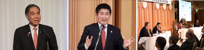 (左から、北前船フォーラムで主催者挨拶を行う長野県知事 阿部守一、地域連携研究所大会で主催者挨拶を行う衆議院議員 福原淳嗣。北前船フォーラムで「地方における高付加価値インバウンド観光の推進」をテーマに、研究者、行政経験者、宿泊・観光事業者が多角的な視点から議論。モデレーターを務めたのは清泉女子大学学長 山本達也、パネリストには、観光庁元長官で運輸総合研究所理事長業務執行理事の和田浩一、自遊人代表取締役 岩佐十良、扉ホールディングス代表取締役 齊藤忠政の3名が登壇)