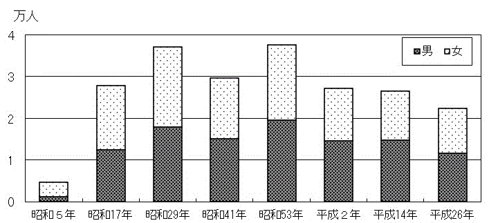午年生まれの人口を出生年別にみると、昭和53年生まれ(令和8年中に48歳になる人)が37,600人で最も多く、次いで昭和29年生まれ(同72歳になる人)が37,000人となりました。最も若い平成26年生まれ(同12歳になる人)は22,300人となっています(表1、図1)。