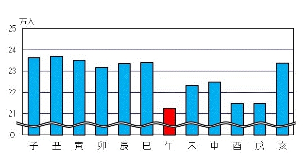 また、人口を十二支別にみると、丑(うし)年生まれが237,000人と最も多く、次いで子(ね)年生まれとなり、最も少ないのが午(うま)年生まれとなっています(表2、図2)。