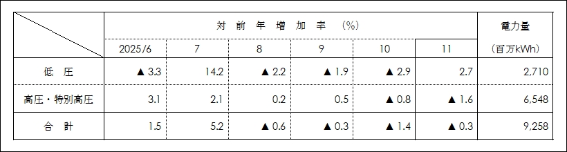 | 需要電力量は、気温が前年を下回ったことによる暖房設備の稼動増はあるが、一部お客さまの操業日数減などから、対前年増加率0.3%と4ヶ月連続で前年実績を下回り、93億kWhとなった。 |