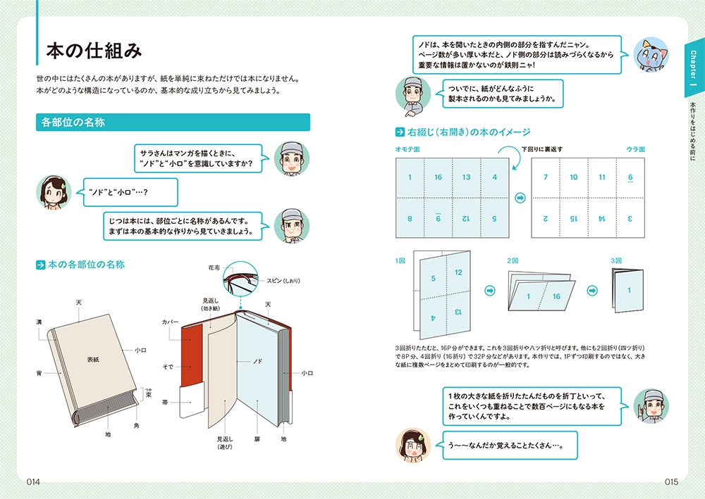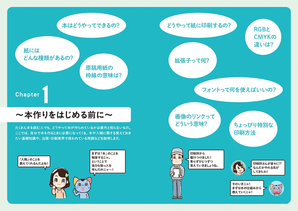 前半は、本作りをはじめる前に必要な基礎知識や入稿に関する覚えておきたい出版・印刷業界で使われている用語などを説明。後半は、実際の作業の中で起きる、“あるある”なトラブルを事例ごとにマンガでわかりやすく紹介しています。