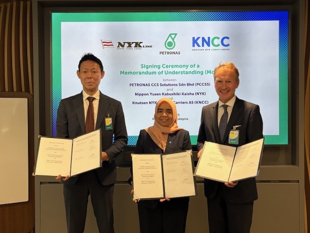 日本郵船株式会社とグループ会社のKnutsen NYK Carbon Carriers AS(クヌッツェン・エヌワイケイ・カーボン・キャリアーズ、以下「KNCC」)はこのほど、マレーシア国営石油・ガス企業であるPetroliam Nasional Berhad(PETRONAS)の子会社Petronas CCS Solutions Sdn. Bhd.(以下「PCCSS」)(注1)と、常温昇圧(EP)方式(注2)を活用したCarbon dioxide Capture and Storage(CCS)バリューチェーンの実現可能性を共同で評価するための基本合意書(MoU)を締結しました。合意書に基づき、LCO?(液化二酸化炭素)の越境海上輸送、一時貯蔵、地中貯留層への海底下圧入などを含む技術面・商業面の実現可能性を検証します。