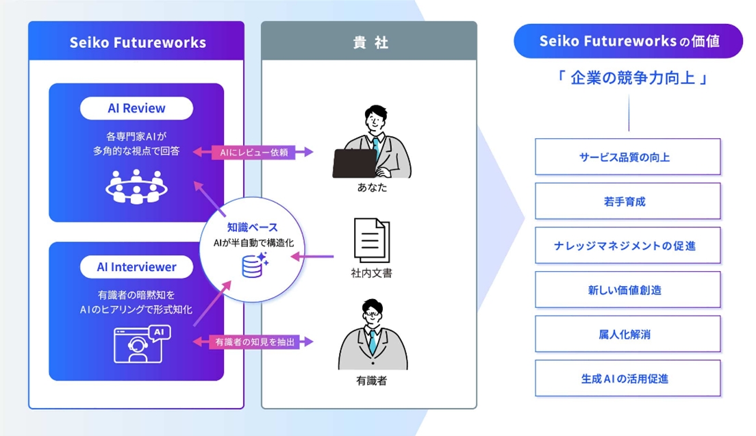 Seiko Futureworksは、企業ルールやナレッジを安全に反映できる生成AIプラットフォームです。AIインタビュアーのほか、AIレビュワーや円卓会議などの機能を備え、業務プロセス全体にわたって知見の取得・活用・継承をシームレスに支援します。