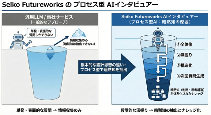 Seiko Futureworks のAIインタビュアーは、従来のヒアリングでは難しかった深層の知識を有識者から抽出することで、組織の競争力を高めるための本質的な知見を蓄積するインタビュー設計を実現しています。