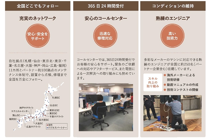 コーヒーをおいしく安定した品質でご提供いただくため、ラッキーコーヒーマシンでは全国に自社11拠点・パートナー約100拠点から熟練のエンジニアがメンテナンスに伺います。さらに、365日24時間受付でお客さまをサポートしています。