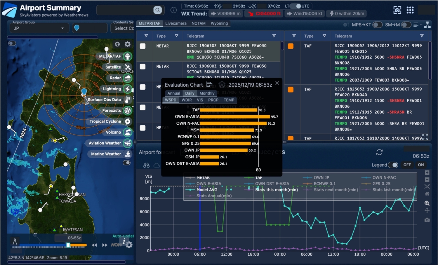 「SkyAviators」は、運航に関わる人々が運航の可否判断を正しい情報と根拠に基づいて行うことを重視しています。そのため、TAFやECMWF(欧州中期予報センター)、GFS(米国気象局モデル)、当社独自の気象モデルなどの予測精度を評価し、その期間のうちTAFや気象モデルがどれだけ精度が良いのかを空港ごとに適中率を可視化しています。TAFと気象モデルで見解が分かれる、判断の難しい気象状況下においても、気象モデル評価を参考にした明確な運航判断を可能にし、意思決定の質を高めます。