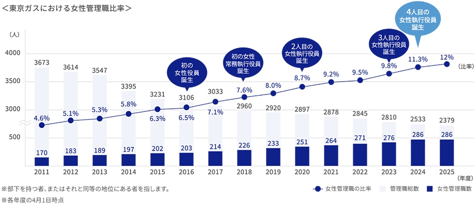 東京ガスは、2018年に子育て支援に積極的に取り組む企業として「くるみん認定(以下「くるみん」)」を取得していますが、仕事と育児の更なる両立を推進するため、育児休職取得による収入・キャリア・職場の負担に対する不安に寄り添う「育休推進に向けた3つの施策」*2や女性のキャリア形成・成長支援策など、様々な取り組みを実施してきました。これらの取り組みの結果、男性の育児休職取得率の向上や女性の高い継続就業率の維持といった成果が表れており、こうした実績が評価され、このたび「くるみん」の上位認定制度である「プラチナくるみん」を取得しました。