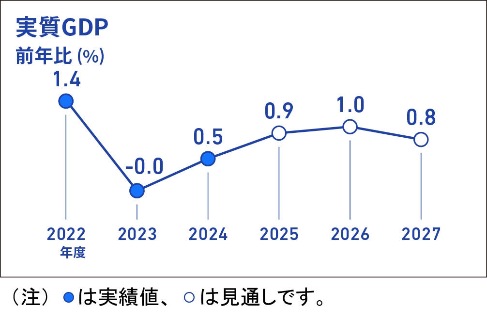 日本経済は、各国の通商政策等の影響を受けつつも、海外経済が成長経路に戻っていくもとで、政府の経済対策や緩和的な金融環境などにも支えられて、緩やかな成長を続けます。