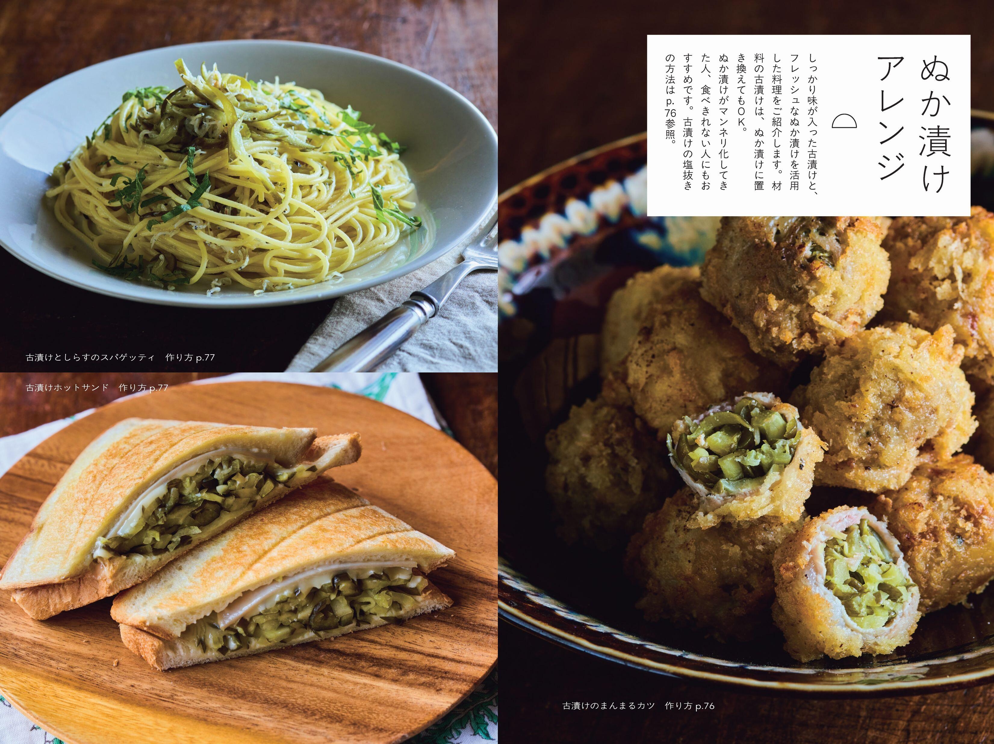 古漬けのまんまるカツ/古漬けとしらすのスパゲッティ/古漬けホットサンド/古漬け炒飯/ジューシー古漬け餃子/古漬けチャンプルー/古漬けポテトサラダ/かくや和えのせ冷ややっこ/かくや和え茶漬け/ぬか漬けアチャール/ぬか漬けタルタルソース/キャベツのぬか漬け豚汁/ぬか漬けでバインミー風