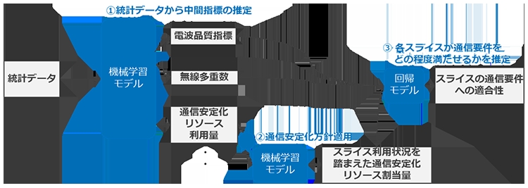 本技術では、設備から取得したデータをもとに通信要件への適合性を直接推定するのではなく、まず通信特性に影響を与える電波品質指標や無線多重数、通信安定化リソース利用量等の中間的な指標を機械学習で推定します。そのうえで、スライスごとに設定された安定化の方針をこの中間指標に反映・調整し、最終的にその値を利用して、スループットなどの指標の観点で各スライスが通信要件を満たせるかを推定する仕組みとしています。