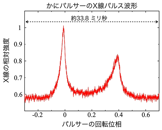 中性子星「かにパルサー」が1回自転する約33.8ミリ秒の間に、X線の強いピーク(山)が二つ現れる。
