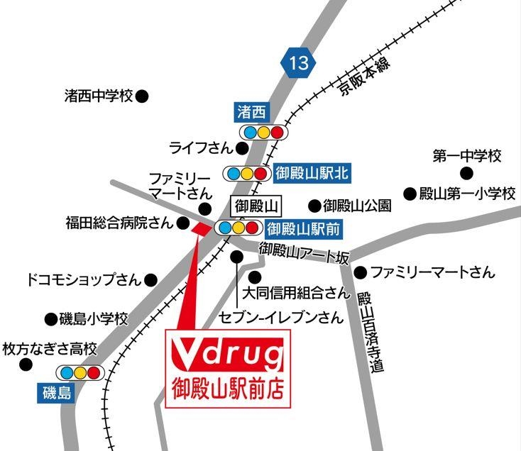 V・drug 御殿山駅前店は、府道 13 号京都守口線「御殿山駅前」西側に位置します。 同店の開設により、当社の事業所は570 店舗となります。