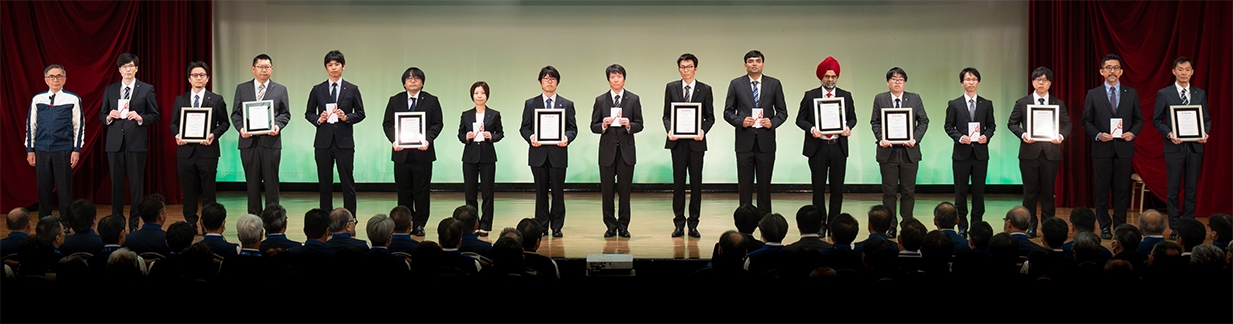 功労表彰は、社是(1.製品づくり、2.会社づくり、3.人間づくり)の精神に則り、知恵を出し、行動し、不断の努力を重ねた個人、チーム、または取り組みの中で、他の模範となるものを「褒め称え、感謝し、労いの気持ちを込めて」表彰する制度であり、1967年度に制定されました。