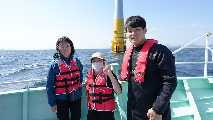 当日はこどもたちが命名した風車を間近で視察できるよう風車の設置海域へ船舶で移動しました。視察参加者は実際の風車の大きさに驚き、その風車が浮いていることを興味深く観察している様子でした。