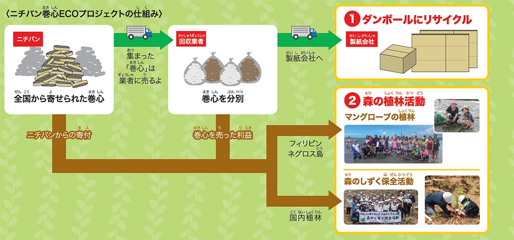 回収した巻心は、ダンボールにリサイクルされるとともに、リサイクルによる収益金と当社からの支援金を下記2つの環境保全活動に役立てます。
