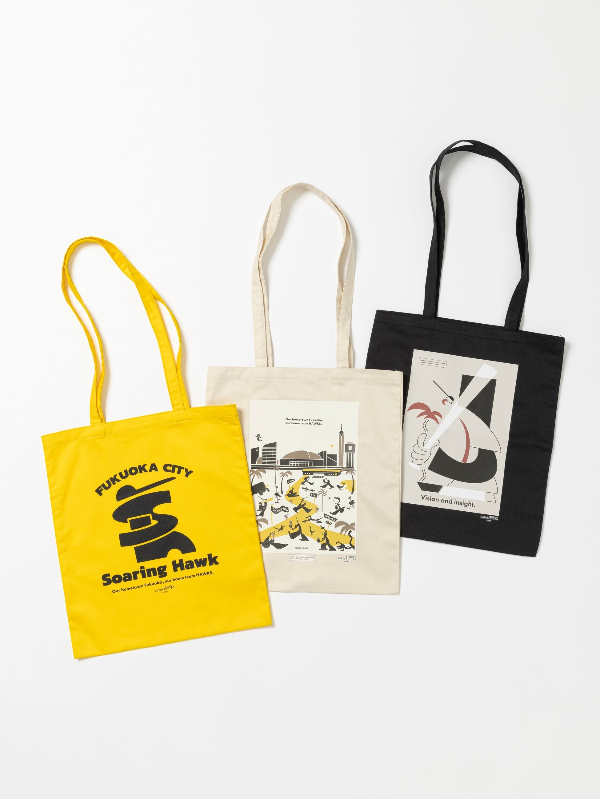 応援グッズから日用品まで幅広く収納できるA4サイズ対応トートバッグ。Tシャツとリンクしたグラフィックで、持ち歩くだけでホークスのムードが感じられます。肩掛けしやすいハンドルと軽い素材で、試合観戦にも毎日の外出にも活躍するアイテムです。
