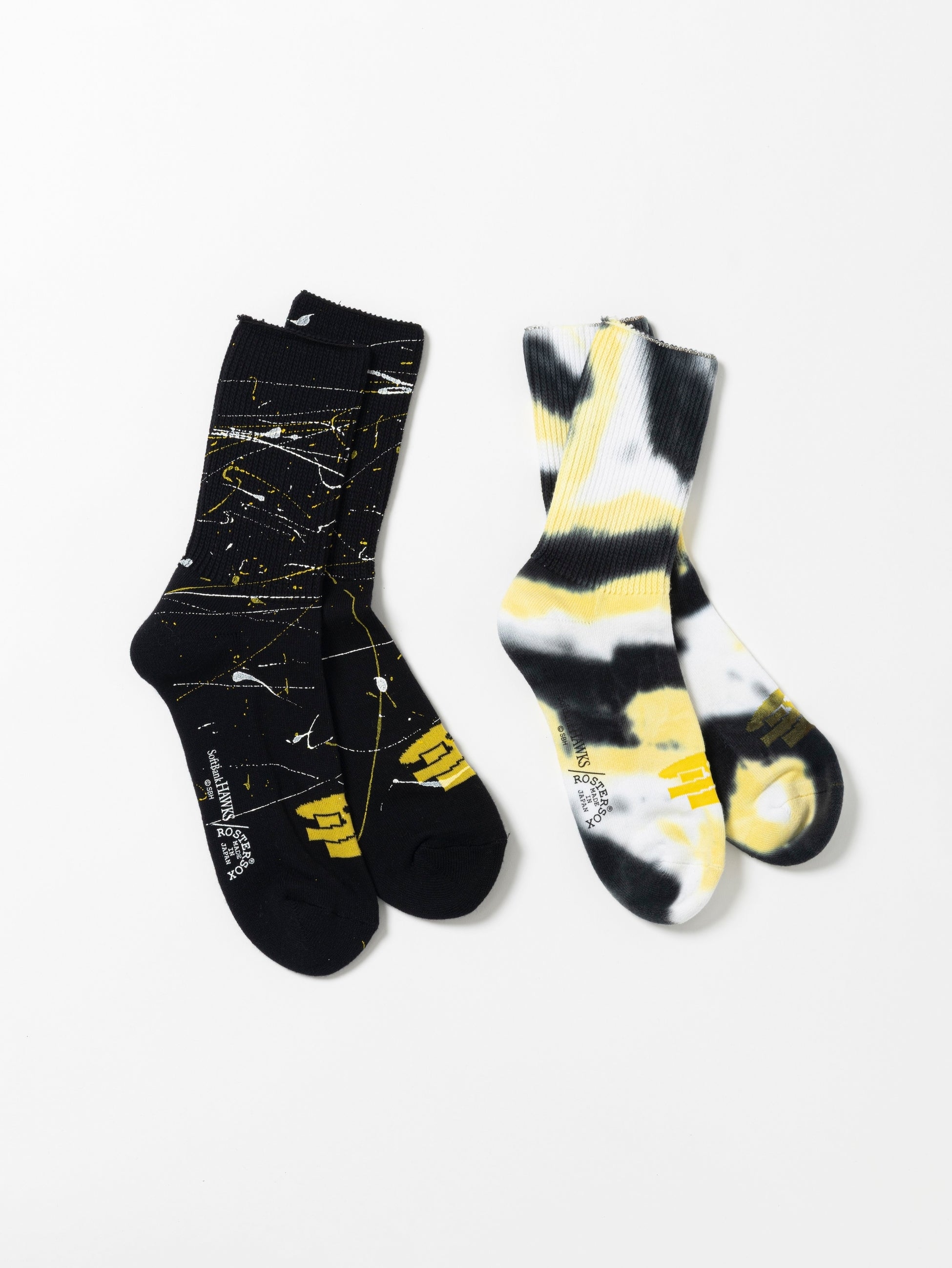 野球用語「Roster(1軍登録)」に由来するソックスブランド「ROSTER SOX」のボディをベースに、ホークスのチームカラーを想起させるペイントデザインをジャガード縫込みで表現しました。足元からホークスらしさを楽しめる一足です。