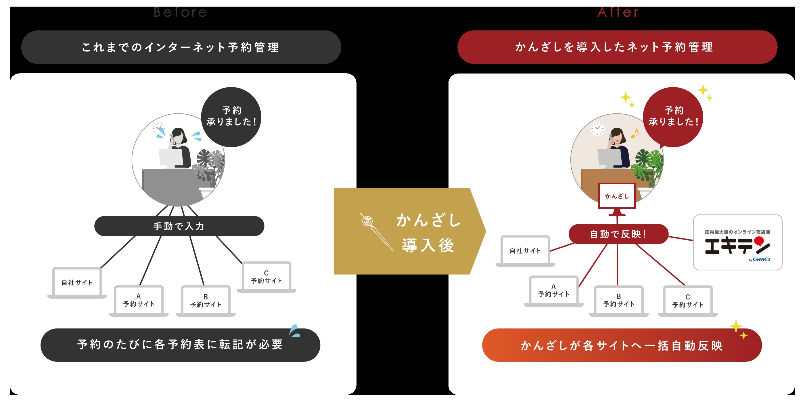 GMOインターネットグループのGMOデザインワン株式会社(代表取締役社長:高畠 靖雄 以下、GMOデザインワン)は、同社が提供する店舗情報ポータルサイト「エキテン byGMO」において、2026年4月13日(月)より、パシフィックポーター株式会社(代表取締役社長:真玉 寿人)が提供する予約一元管理システム「かんざし」と連携を開始しました。本連携により、「エキテン byGMO」に登録している店舗は、その他の複数の予約サイトからの予約情報を自動で一元管理できるようになり、予約重複や転記作業などの業務負荷を軽減し、生産性向上を実現します。
