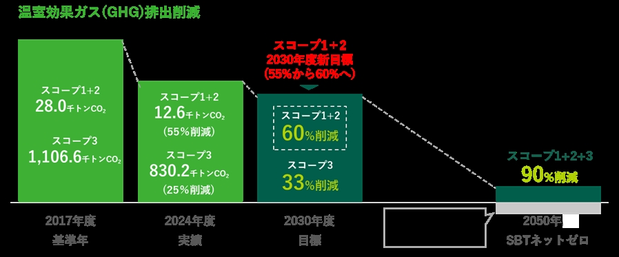 今回のアップデートは、2024年度において、従来の2030年度目標であった55%削減を早期に達成したことを踏まえたものであり、当社の脱炭素に向けた取組みが、計画を上回って進展していることを示すものです。今後も脱炭素移行計画の下、事業で培ってきた省エネ技術の活用や再生可能エネルギーの利活用などを通じて、事業活動に伴うGHG排出削減の取組みを一層強化していきます。
