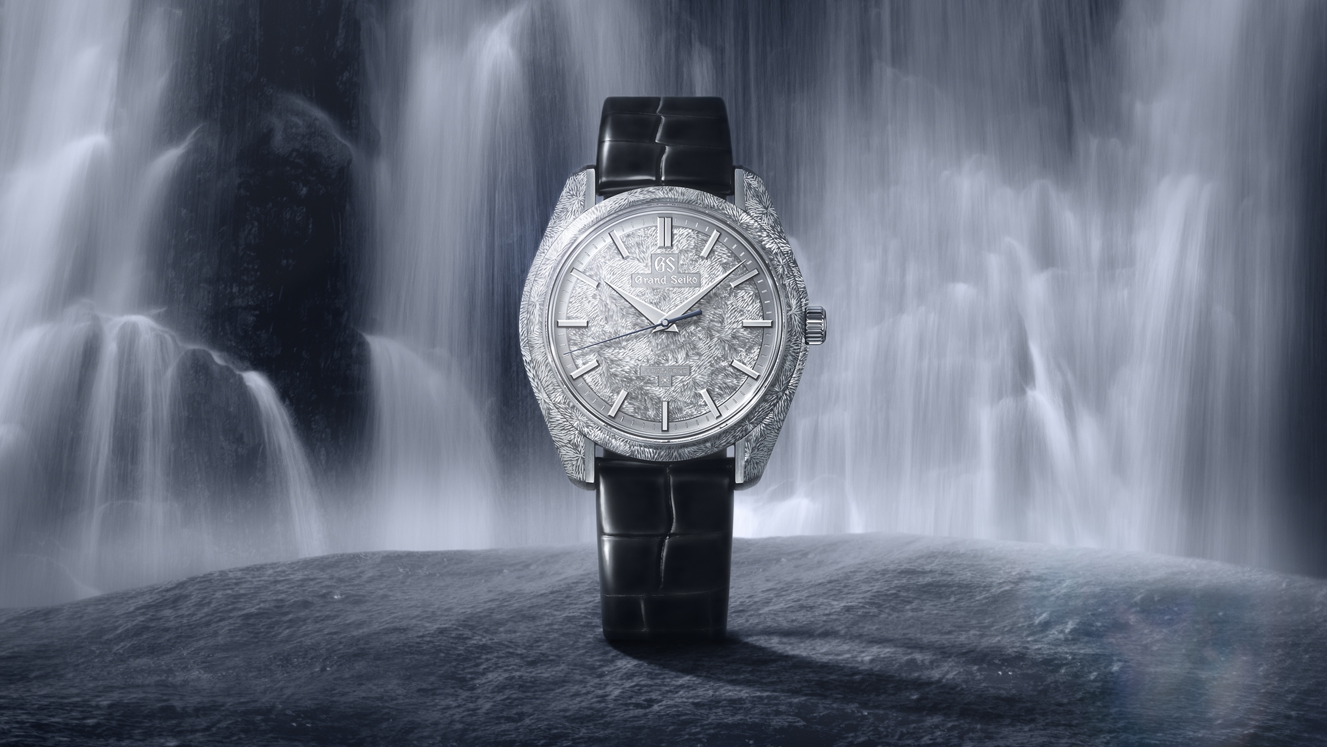 グランドセイコーのスプリングドライブモデルの製造地である信州。その蓼科高原には、美しい原生林が広がっており、木々の間を蓼科大滝が流れています。滝は、その水の勢いの強さから飛泉とも呼ばれますが、本作は、その飛泉が生み出す幻想的な情景を、匠がハンドエングレービングで写し取りました。ケースとダイヤルに施された、繊細かつダイナミックな模様が、日本独自の美意識から生まれた光と陰の多様な表情を生み出します。