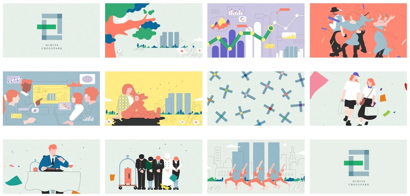「HIBIYA CROSSPARK」から生まれるさまざまな「風」を、当街区のコンセプトを体現するロゴマークを軸に、アニメーションを用いて視覚的に表現しています。「HIBIYA CROSSPARK」の世界観を伝えるこのシンボリックなムービーを通して、この街が完成する未来への期待感を醸成します。