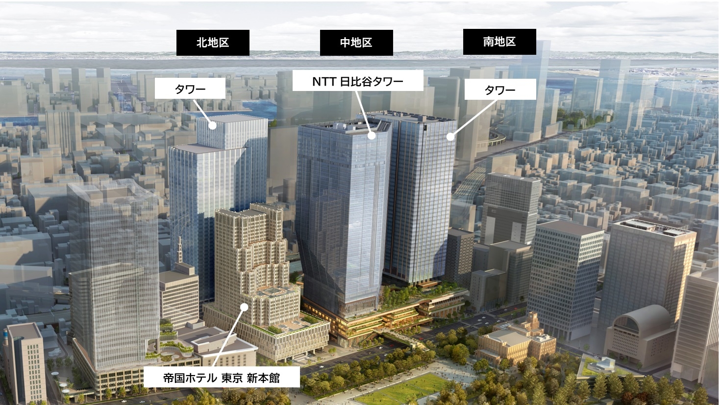 本プロジェクトは北地区・中地区・南地区の3つの地区で構成されており、オフィス、商業、ホテルなどの多様な用途から構成される、都心最大級延床面積約110万m2の大規模複合開発です。全体完成に向けて、2028年度に南地区のタワーが、2031年度に中地区のNTT日比谷タワーが順次竣工予定です。