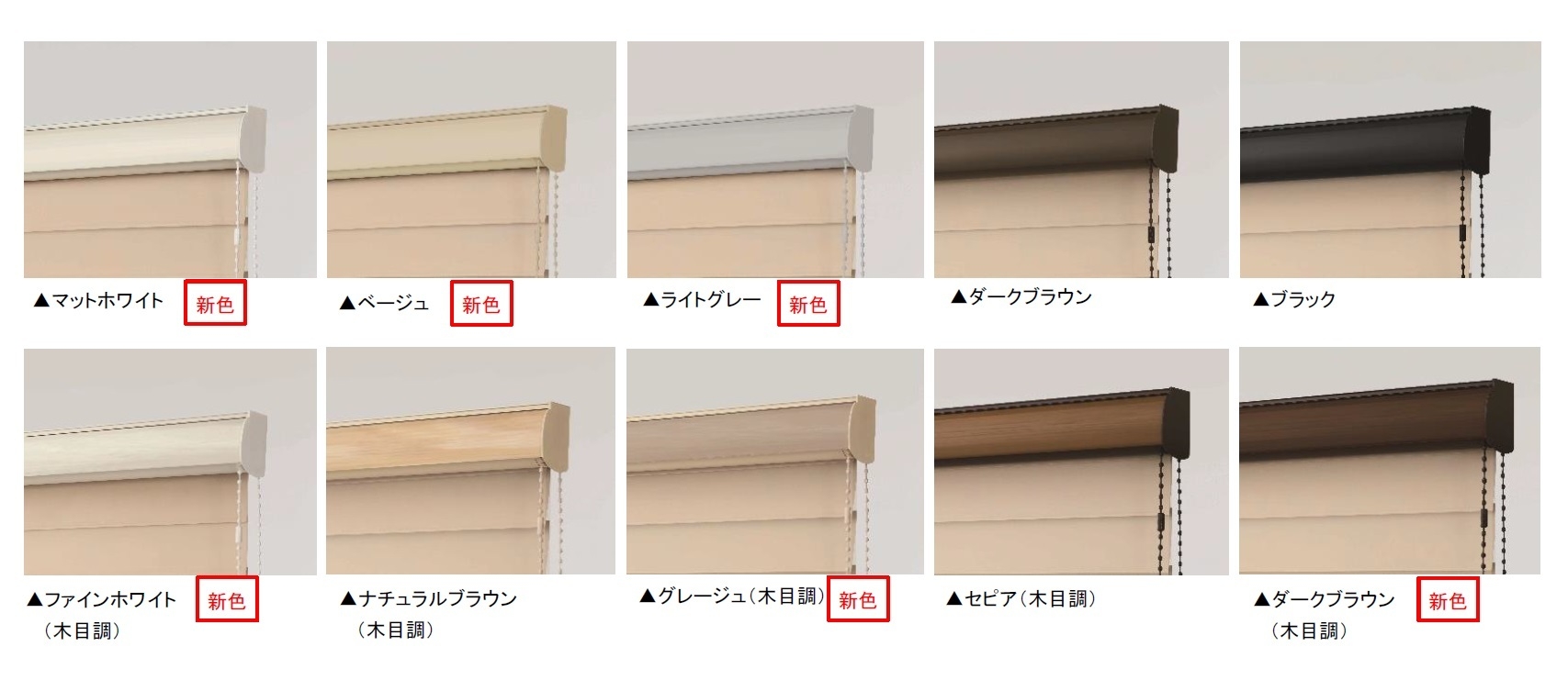 部品色は単色5色、木目調5色の計10色を展開し、建具やインテリアに合わせた選択が可能になりました。ロールスクリーンラルクシールドやタテ型ブラインド「ラインドレープ」とプリーツスクリーンと共通となり、同一空間で製品を使い分けても、部品色を統一でき、空間全体の調和に繋がります。