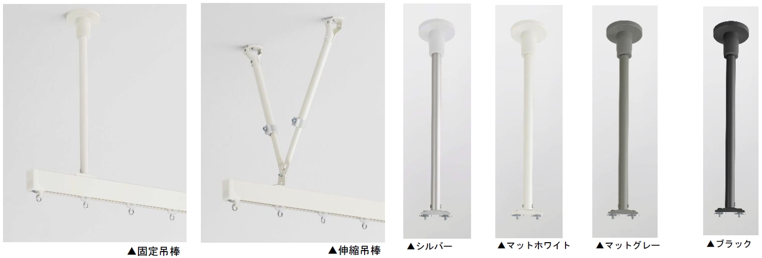 今回カーテンレールと組み合わせて使用する「吊棒」についてもリニューアルし、「固定吊棒」「伸縮吊棒」の2種類をラインアップしました。また、両製品にマットグレーを追加し、モノトーンを基調とした空間との統一感を高めました。カーテンレール「クロシード」と組み合わせることで、空間全体のデザインに一体感を持たせることが可能です。