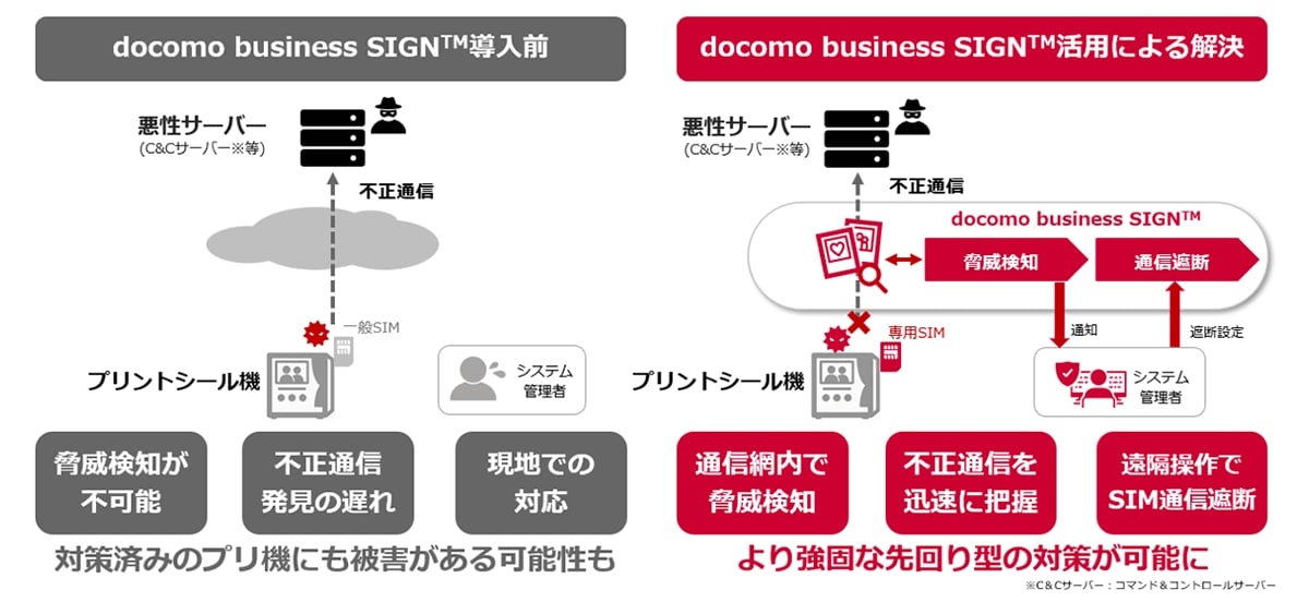 フリュー株式会社(以下 フリュー)とNTTドコモビジネス株式会社(旧 NTTコミュニケーションズ株式会社、以下 NTTドコモビジネス)は、セキュリティ機能を標準搭載したIoT向けのNaaS(Network as a Service)である「docomo business SIGN™」※1を用い、エンタテインメント(以下 エンタメ)業界初※2となるプリントシール(以下 プリ)機のセキュリティ実証実験(以下 本実証)を開始します。本実証では、SIMレベルでの脅威検知・遮断や不正利用の検知、簡易位置情報の把握、運用ポータルでの一元管理を検証します。個人情報を扱うエンタメIoTに適した“先回り型”の安全基盤を構築し、将来のAI連携など新機能拡張に向けた信頼性を高めます。