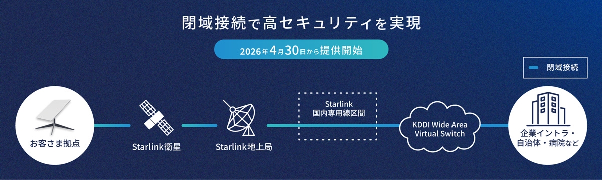 - 注2)インターネットを介さないStarlinkの閉域網接続において国内初。2026年4月23日時点、KDDI調べ。